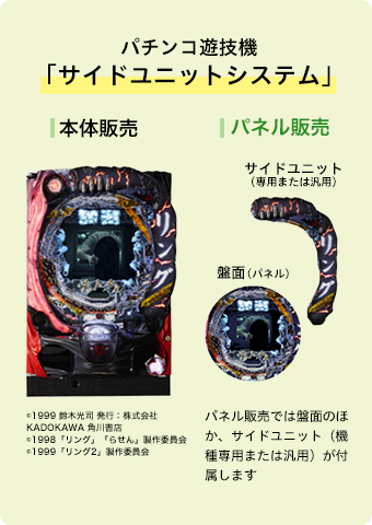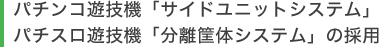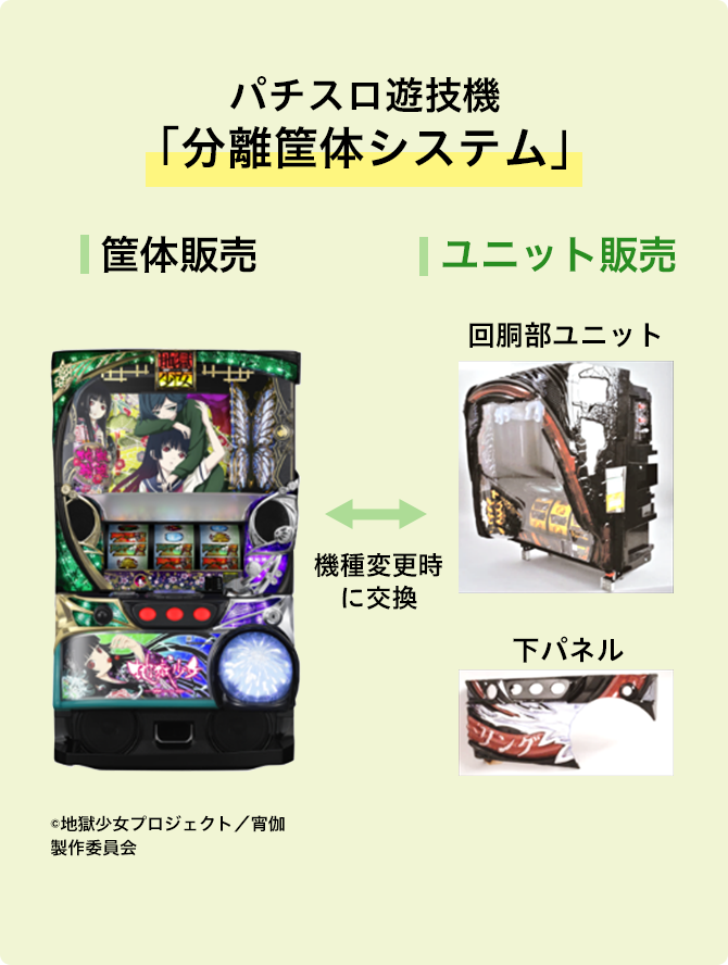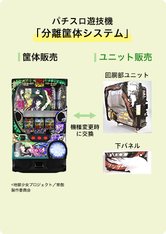 パチンコでは本体枠とパネル、パチスロでは筐体と回胴部ユニット・下パネルがそれぞれ脱着・交換できるシステムを採用し、枠や筐体はそのままホール様にて継続してご使用いただくことにより、資源の有効利用と廃棄物の削減に貢献しています。