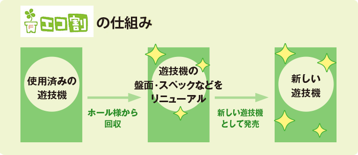 ホール様から回収させていただいた使用済み遊技機で従来は廃棄していた機種固有の部品をリユース(再使用)し、同じ機種の別スペックとして再生する「エコ割」システムを導入しております。従来のリユース活動より廃棄物の削減効果を大幅に向上させ、また、ホール様に対しても低価格での提供が可能となりました。