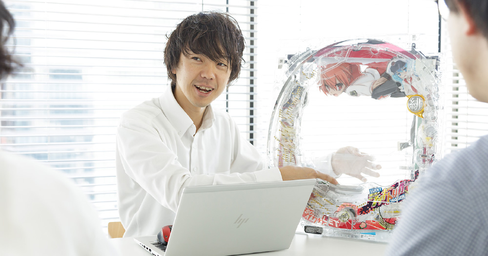 パチンコの開発の中でも企画を担当しています。おもしろい演出、リーチ、ギミック、スペックを考える仕事です。